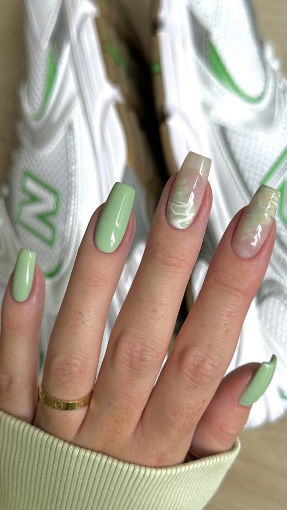 Spring is the season that adds the freshness of these square long nails with soft green and white marble effect. The look is suitable to wear with outdoor activities of the season such as having a picnic in the park or taking a slow walk in the blooming garden.