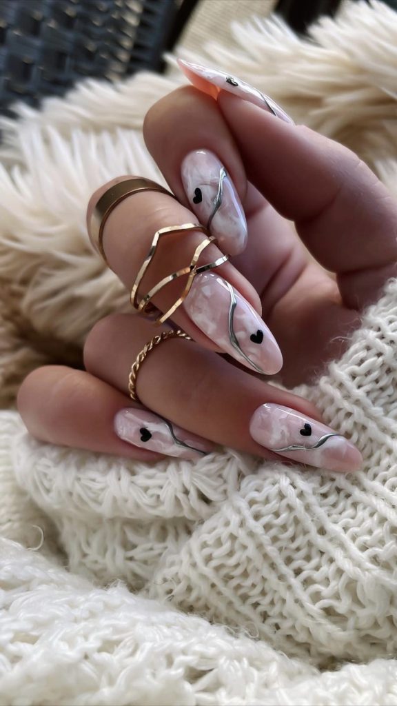 In 2024, marble patterns will still be a trend, and this particular collection has a small black heart that gives it a romantic nuance. The coffin shape of these nails is both audacious and delicate, perfect for the real romantic who likes to express her feelings through her own style.