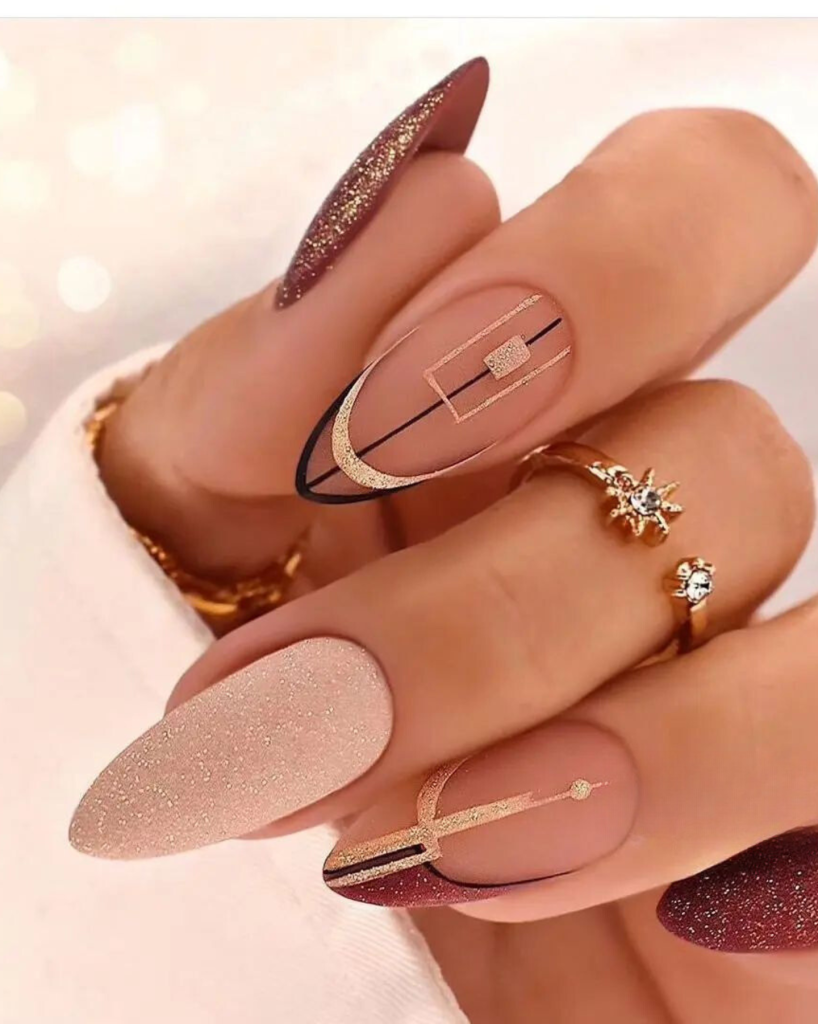 Nail art featuring abstract designs is a profound as well as the most creative representation of black lines and golden accents on a pink base. Longlasting nails are a platform for self-expression, the best choice for a woman who prefers to set fashion trends instead of following them.