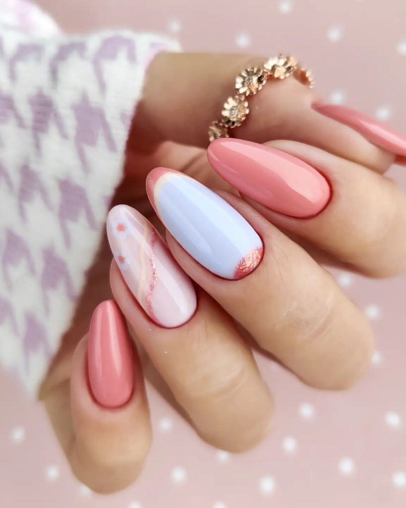 This design is a tribute to the most favorable spring colors: dreamy pink and sky blue with a bit of sparkling glitter. The nails are of medium lengths serving as a contemporary twist to the soft color scheme. The design can be donned at a spring-themed event or worn just for the pleasure of the seasonal touch in day-to-day life.