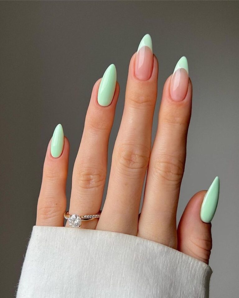 These are” almond-shaped nails” that are “invoking” the” freshness” of a “spring” morning. A light “mint green” moves into a “blush pink” making a suggestion about a color scheme that is as equally fresh as sipping” sorbet” on a hot summer day. The” nails” are a smooth push for the woman who enjoys the surprising to break the mold and color outside the lines.
