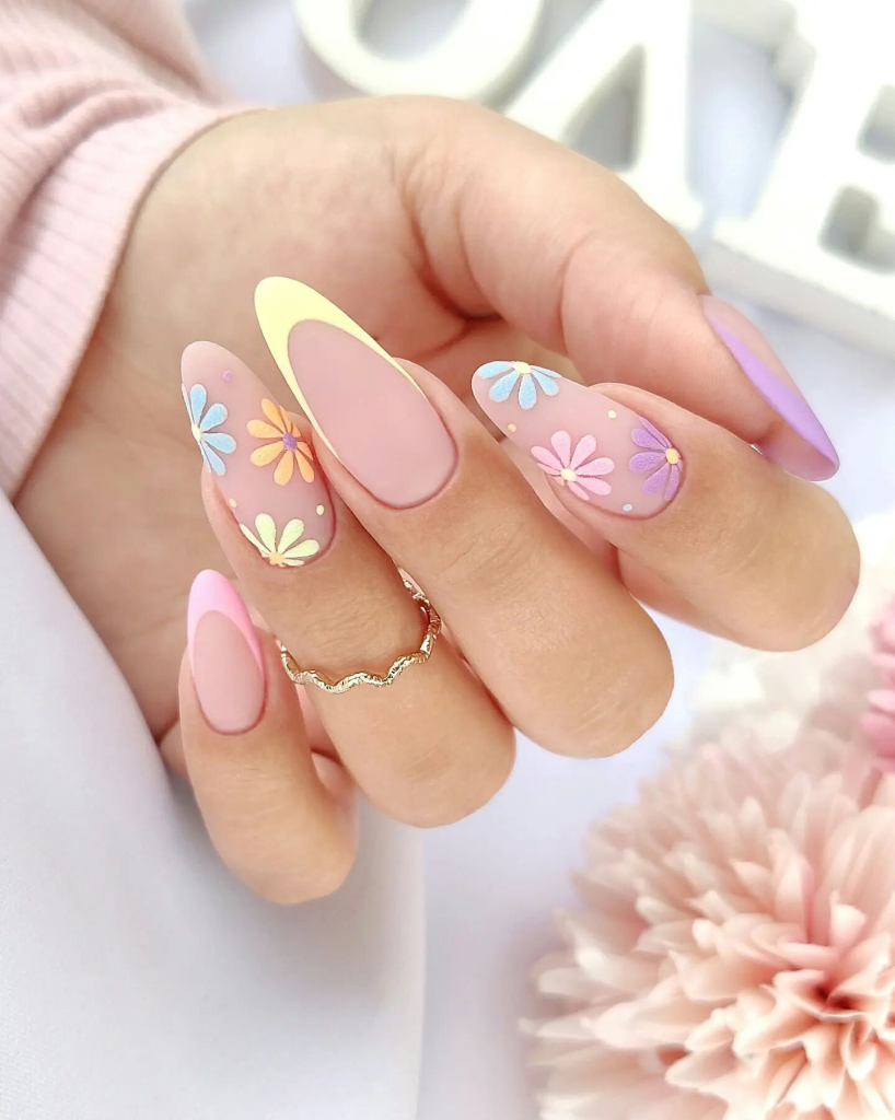 The soft pink hues of these almond nails remind one of the first tender blooms of the season. The short and natural nails length makes it a practical choice for everyday wear, while the cute daisy motifs add a dash of springtime fun.