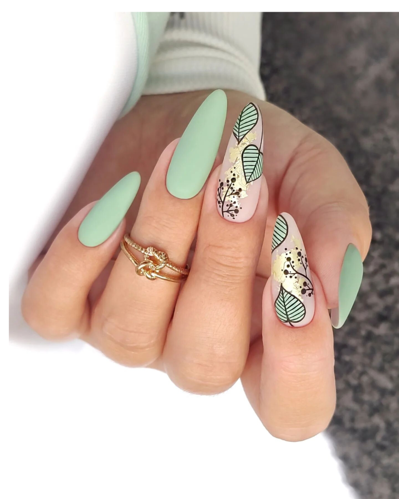 Green almond nails like these are reminiscent of spring’s first whispers, where green buds promise new life. These nails feature a matte finish and delicate leaf patterns, creating a natural nails look that’s both refreshing and chic. It’s an example of how designs 2024 can be both simple and intricate, inviting a second glance.