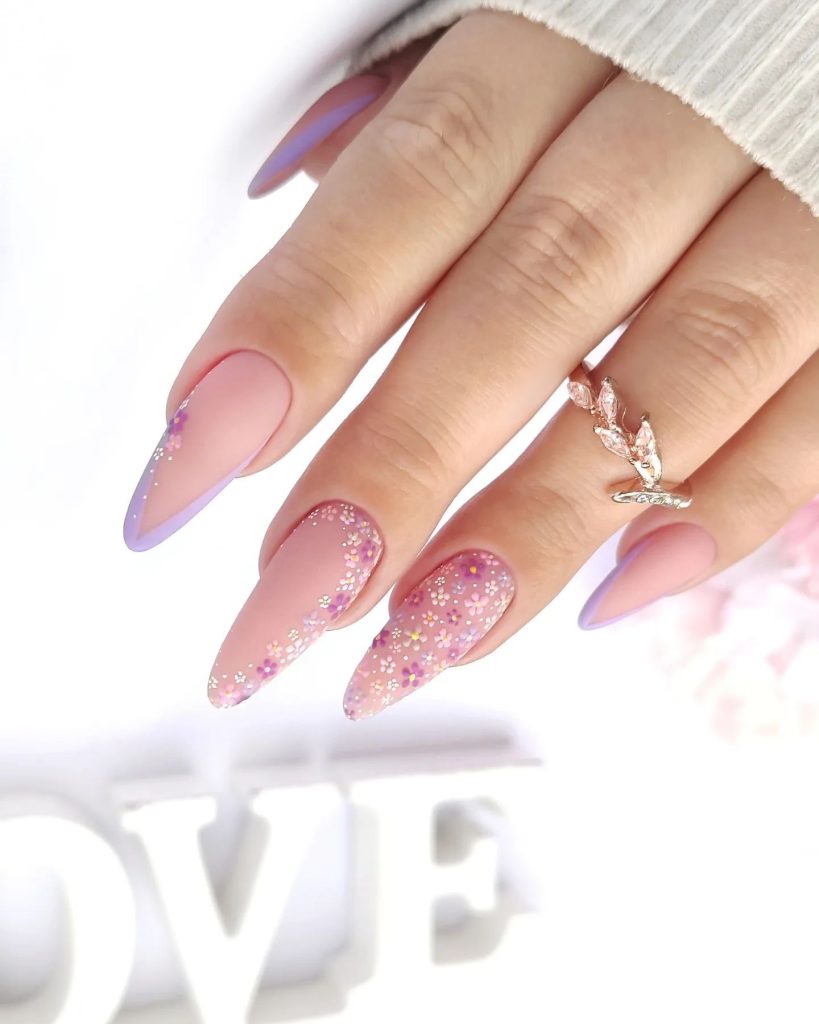 These almond nails are like a springtime gala on your fingertips. The gradient of pink and lavender adorned with delicate flowers offers an elegant take on the season’s trends. Suitable for acrylic or gel nails, this design is a celebration of femininity and cute sophistication.