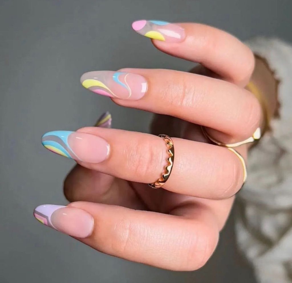 A nod to retro vibes with a modern twist, these almond nails feature whimsical swirls in a pastel palette. It’s a fun interpretation of designs 2024, blending pastel purple and yellow to create a look that’s both cute and eye-catching.