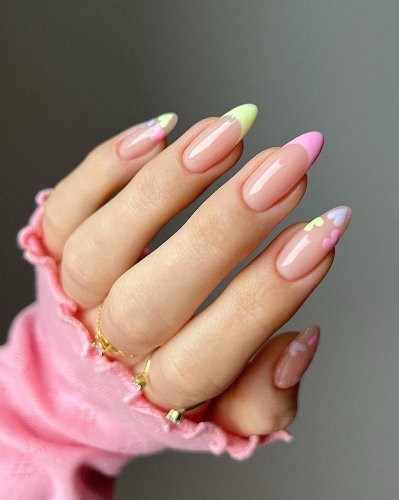 Joyful hearts take flight on these almond nails, with playful shades of pink and splashes of white. This design is a celebration of youthful exuberance and would add a vibrant touch to any springtime outfit, capturing the essence of fun and cute in every detail.