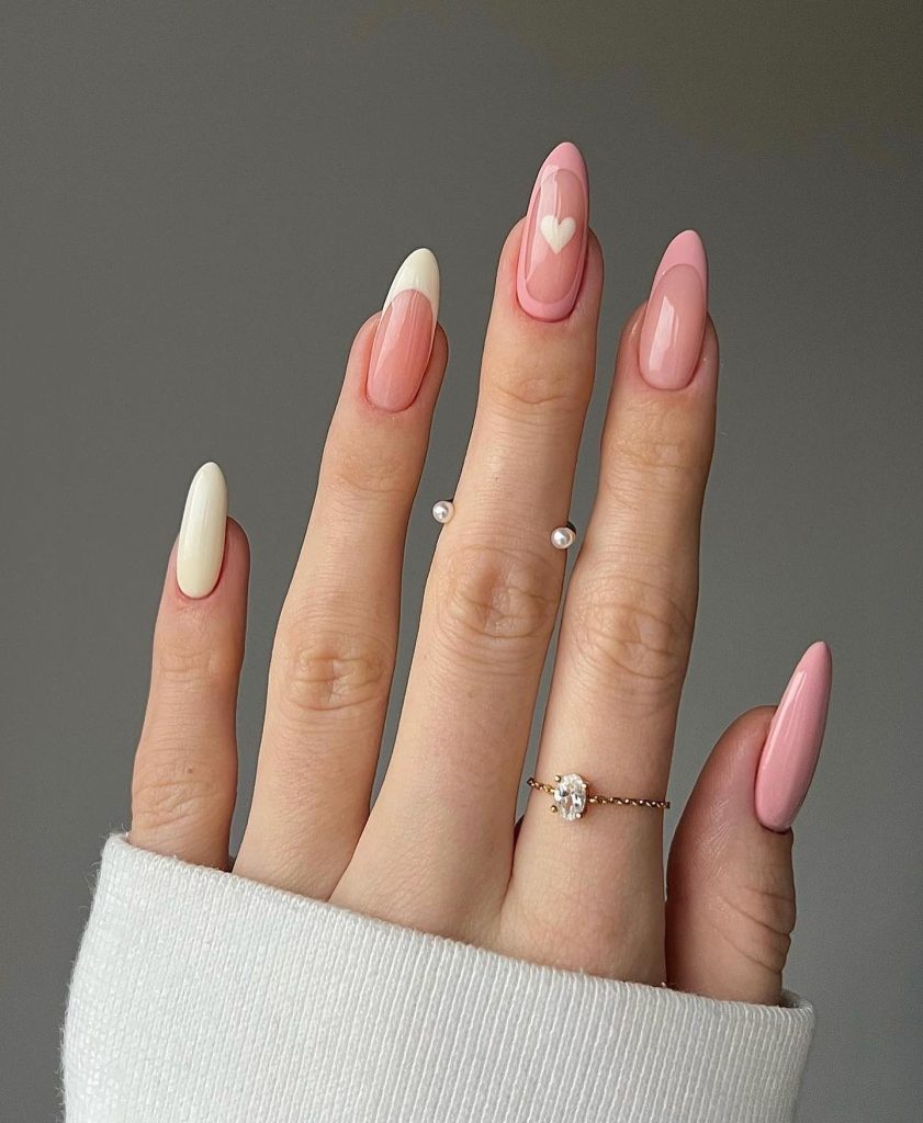 Subtlety meets romance with these almond nails, featuring a tender pastel pink base and delicate white hearts. This design whispers of love letters and quiet moments, perfect for those who hold a penchant for romance. These nails would pair exquisitely with an engagement ring or a simple gold band, symbolizing love’s gentle embrace.