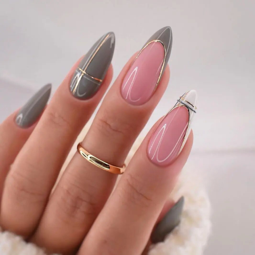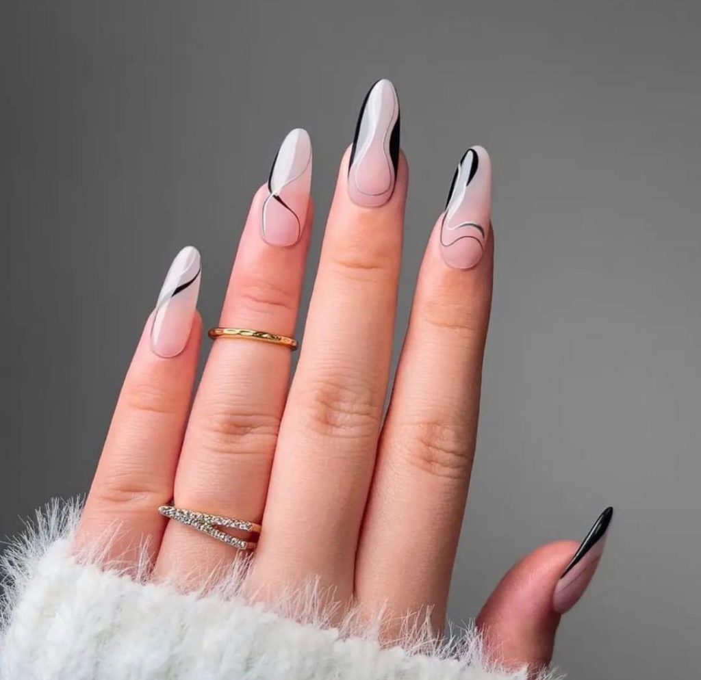 Artistic expression flows freely with these almond nails, where pink and black swirls dance over a pastel canvas. It’s a design that evokes the free-spirited nature of spring, ideal for the avant-garde woman who views her nails as a canvas for creativity.