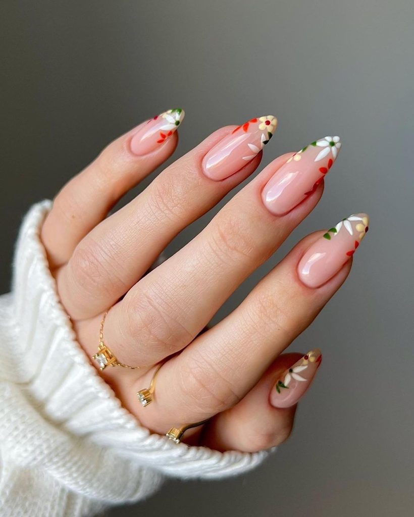 Spring’s bounty blooms on these nails, where a crescent of floral designs adds a dash of nature’s beauty. With a natural nails look, this style is a subtle nod to the trend of minimalist art, perfect for those who appreciate a touch of understated sophistication.
