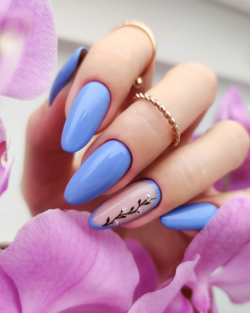 The serenity of a clear blue sky is perfectly captured in this almond nail design. The vibrant pastel blue is a breath of fresh air, offering a bold yet calming presence. Adorned with a solitary branch, these nails are like a piece of springtime’s clear, blue expanse resting at your fingertips.
