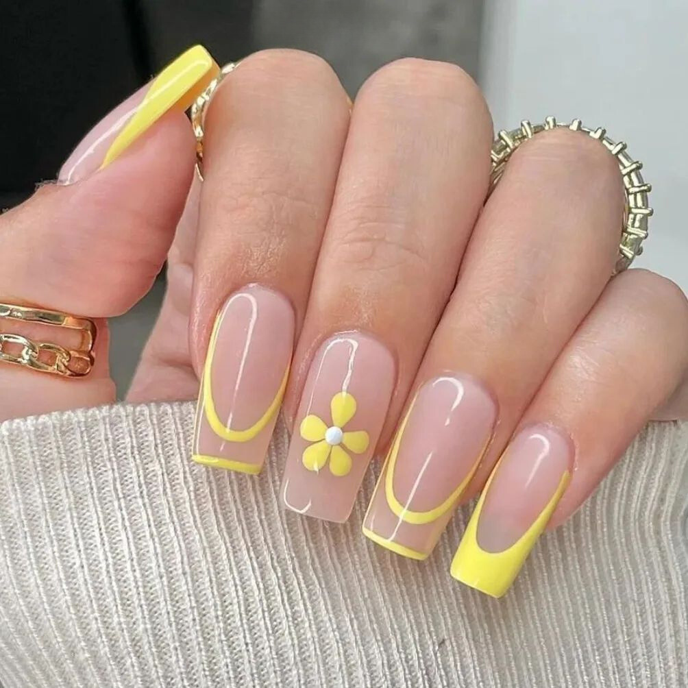 You can brighten your day and be happy with these playful Gel nails that give a sunny twist to the classic French tip. The deep yellow tips are decorated with a cute little daisy that creates a cheerful vibe