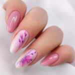 These Gel polish nails imitate the romance of a lavender field. Dainty floral accents contrast with a sheer lilac base, thus creating a fine layout. This design is for the girls who like natural nails but still want to be fashionable and creative. The Round shape is universal and fits every hand; the floral pattern is a tribute to the trend of nature-inspired ornaments.