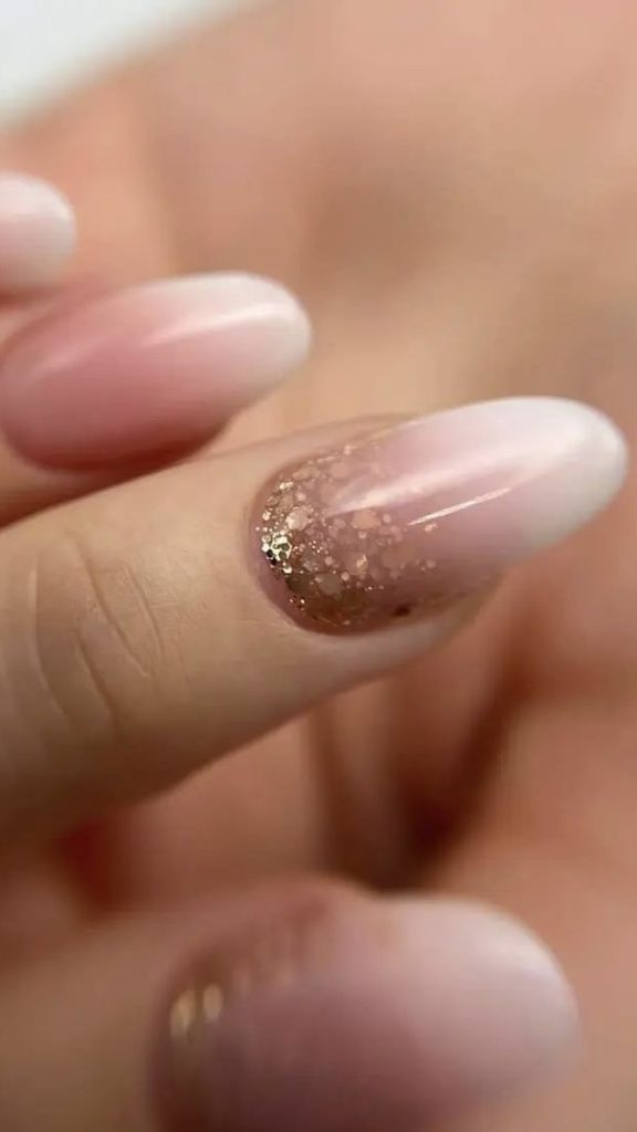 On these nails, a serene pink ombre is kissed by a touch of rose gold at the tips, suggesting a peaceful sunset. The oval silhouette of the nails lends a classic and feminine touch, making it a timeless choice for those who favor a blend of tradition and trend.