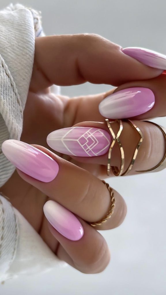 These nails feature a pink ombre base with geometric designs that add an element of sophisticated art. The almond shape enhances the elegance, making them ideal for those who appreciate the fusion of art and fashion.