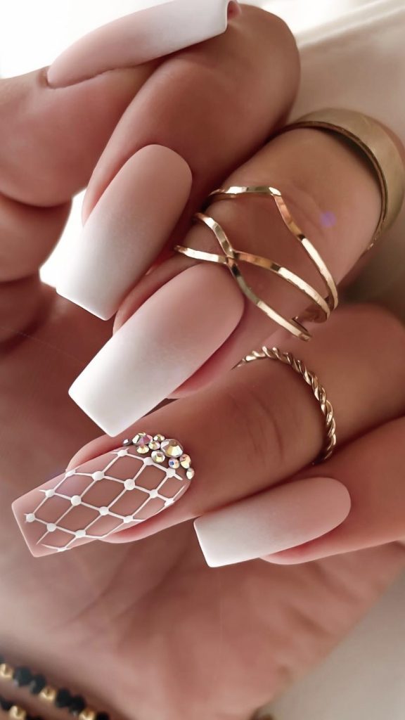 The quintessence of luxury is captured in these nails, where the timeless ombre meets the sparkle of rhinestone embellishments. The matte finish of the coffin nails provides a plush canvas for the diamond-like adornments, creating a look of refined opulence.