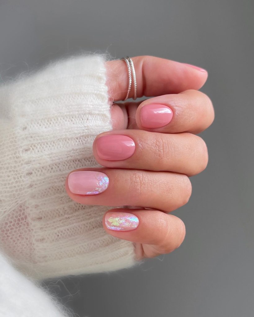 Caught in the gentle sun rays, the opalescent surface showcases these short round nails in the same way that dew drops on the grass of an early spring morning conjure the ethereal. With the addition of a small bit of iridescent glitter, they become like the fragile wings of a butterfly. Instead of jackets, this design is preferred by people who want their style to say it softly.