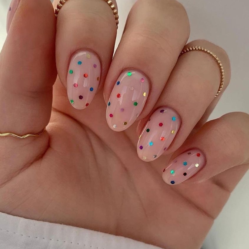 Well, this charming design is a party for your fingers. And unrealistic confetti that glows behind the clear, shiny nails is like colorful dots recalling the gentle descent of confetti that comes at a festive gathering. This design is in a pleasant mood and fits any springtime celebration, adding a bit of fun to your everyday style. Be it a birthday, a bridesmaid party, or just a sunny day, these nails are sure to bring joy and a party vibe to any event.