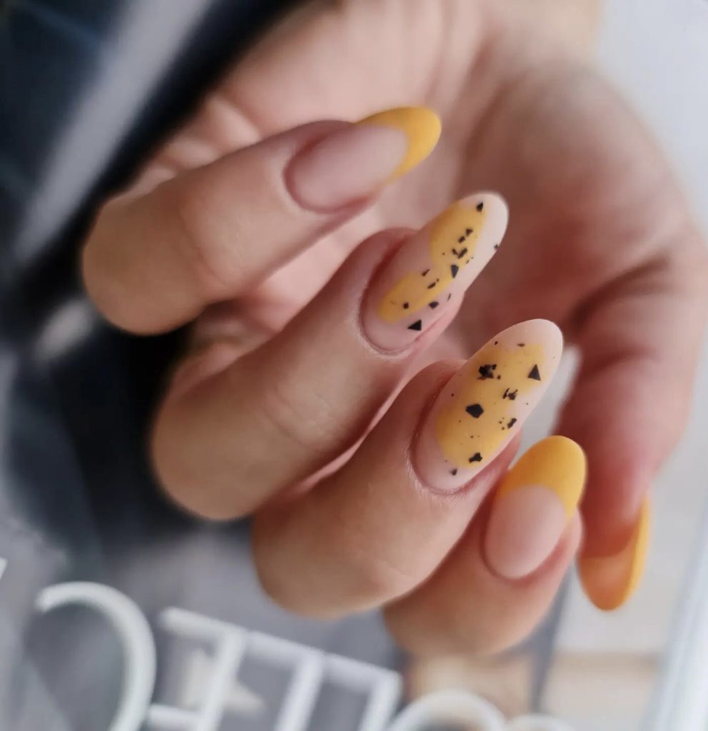 The design is a representation of the sunlight by a matte yellow base with black dots splashed on. It refers to the flowers of spring with freckled petals and the bright days spent outdoors in the sun. These fingernails would be perfect for sitting in the balcony with a cold glass of lemonade in hand or holding a book on the beach during a summer day.