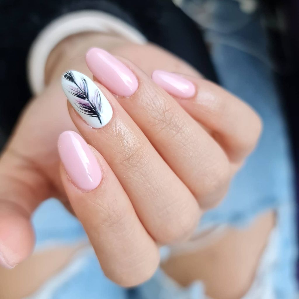 This minimalist concept of just one feather motif on a canvas of soft pink embodies the buoyancy of spring’s mild breeze. A symbolic suggestion to a simple manicure is the addition of an element of dreaminess to the rounded shape of the nails. This quality could be conjoined with a transparent maxi dress, or alternatively, it could include a small touch of magic in the daily casual outfit.