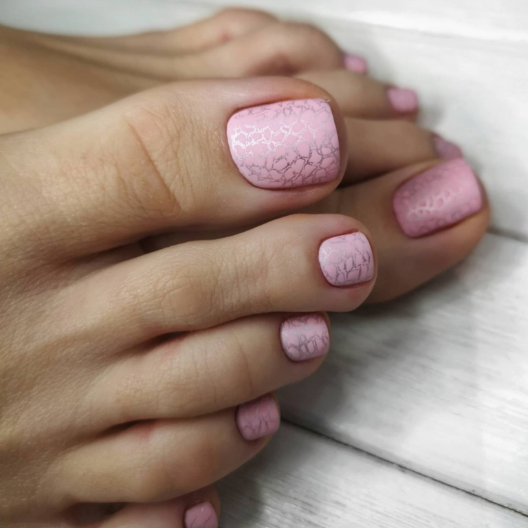 Adding a twist of originality, this pedicure features a pink marble effect resembling broken stones, with each of the nails made to look like a piece of art. The pink shade is cute and fits the seasonal theme, which is the reason for its popularity among the lovers of the 2024 gel short nail trend.
