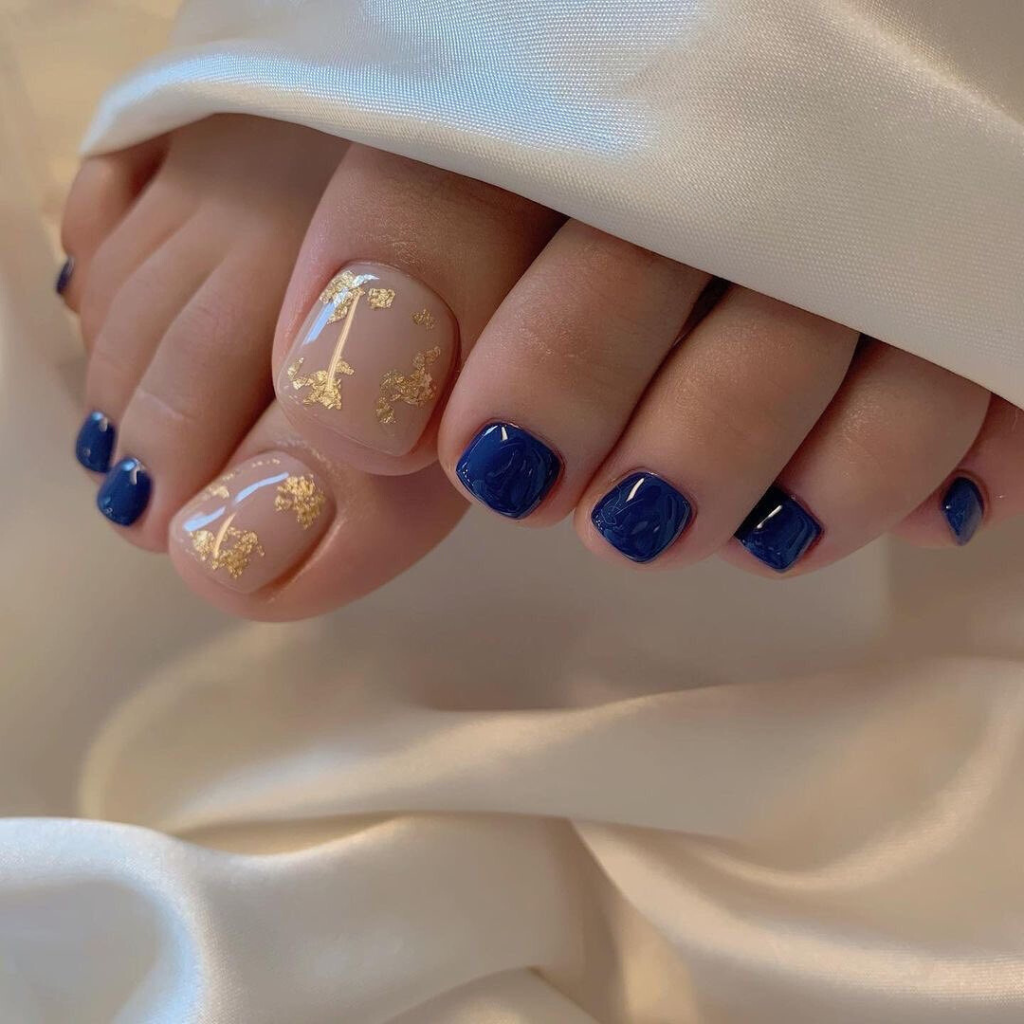 The transformation of the season from lifeless to colorful was tWhat a neat leap of faith it is to trust your own opulence. A great option for spring nails will be this luxuriously imagined royal blue pedicure adorned with gold leaf accents. The 2024 gel colors presented here are not mere shades; they embody your self-assurance and fashion sense. It is a treat for the lady who owns the space and who acts with class and a touch of wealth.