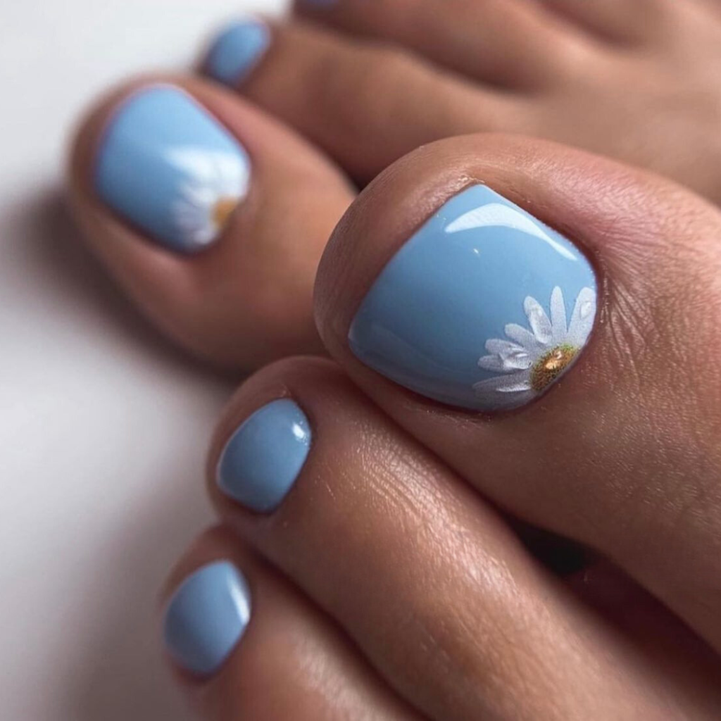 The design of the toe nail color is manifesting the fresh, serene clear blue skies of the spring season. A small white daisy is decorating it which adds a breath of the simple design of nature to the art. It is a fresh breeze and a reference to the 2024 trend that is to bring the outdoor things in every element in fashion.