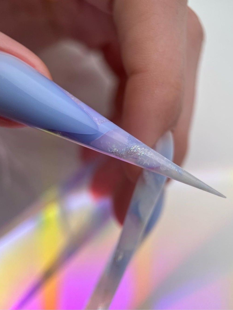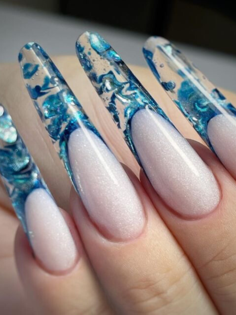 Diving into the depths of the ocean, this design mirrors the mysterious allure of the sea with its deep blue hues and marble swirls. It is the long nails design itself, where the glitter sparkle imitates the sun rays which pierces through the water’s surface. Women who want a rather dramatic but at the same time, elegant look will see this model as a manifestation of their free character, their love for the extreme. Be it a night out with friends or a serious boardroom discussion, the nails are enough for the statement they will deliver.