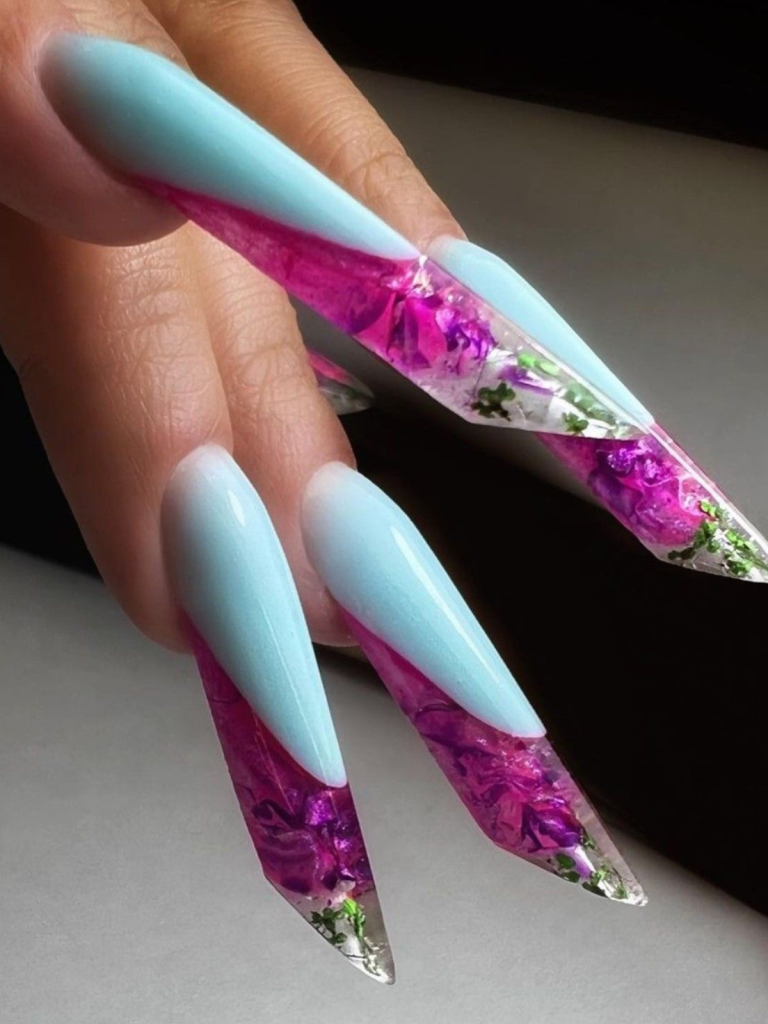 Nature lovers and fans of everything mystical will be enchanted by this design, which is nothing else but a garden entangled with magic. With pure natural pink and green colors accompanied by real encased petals of these design-long square nails which come with the transparent top. This is indeed a very original design of coffins that shows a bold and creative character of the person who can be different and express themselves freely. A matte summer dress or a flowy shirt would be the perfect match for this unique pairing, and you would wear them with the charm of a fairy.