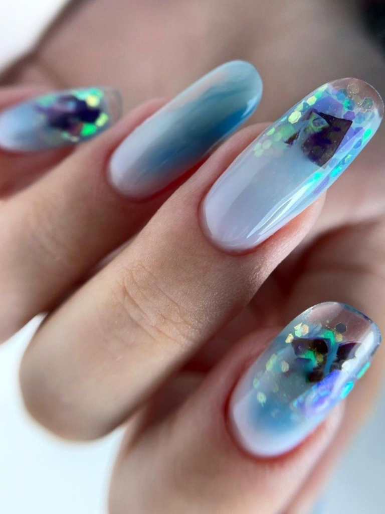 Pale hues of sky blue combine into a somewhat translucent base, which is a backdrop for the colorful iridescent flakes that are distributed throughout the design. This type of nail art is ideal for a short oval and squoval shape; therefore, it is great for everyday wear and formal occasions. The lustrous shining of the flakes creates a mystical effect on the nails, which is suitable for people who bring clouds with them.