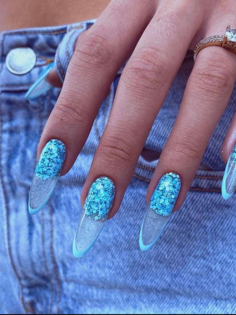 5. Glacial Glamour: Frosted Tips with Turquoise Glitter