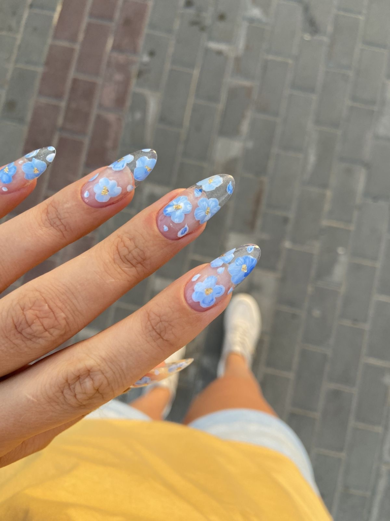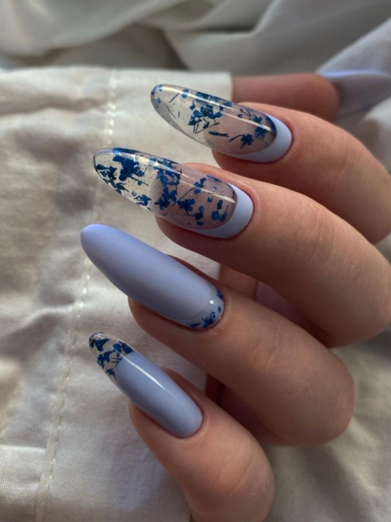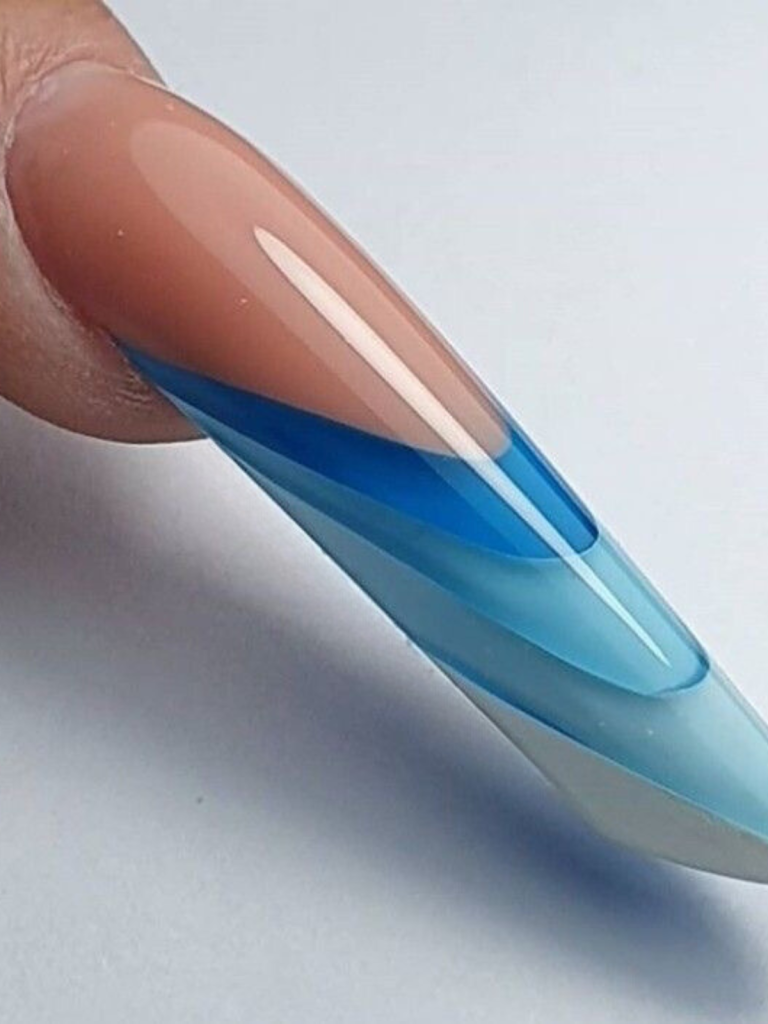 Shifting from a soft, misty blue to a strong cobalt hue, these nails encapsulate the multiple tones of the sea. The gradual transition of the colors lends a dreamy touch to the overall design, while the matte finish on the dark blue gives it a modern twist. The almond short cut is a reference to the depths and colors of the ocean, which is suitable for the ones who are inspired by nature’ s color schema.