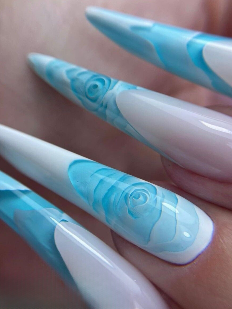 The light blue acrylics are the perfect choice for every fashionista who wants to blend eye-catching colors into their outfit. If you are into moderation, a soft ombre free form remains the top choice, gold flakes bring some luxury, while the vivaciousness of contrasting colors makes the statement, celestial swirl art skill with detailed individual. All year round, these designs light blue acrylics be your envy nail art fashionista. With these modes, we are paying tribute to our imaginative ability and the self-representation that they embody. This fashion fad will not leave the trend spectrum and stays widely among women decorative form of wear. After that, you should choose your favorite design and let the nails speak for themselves.
