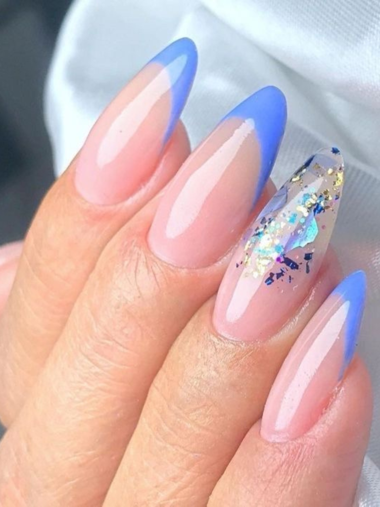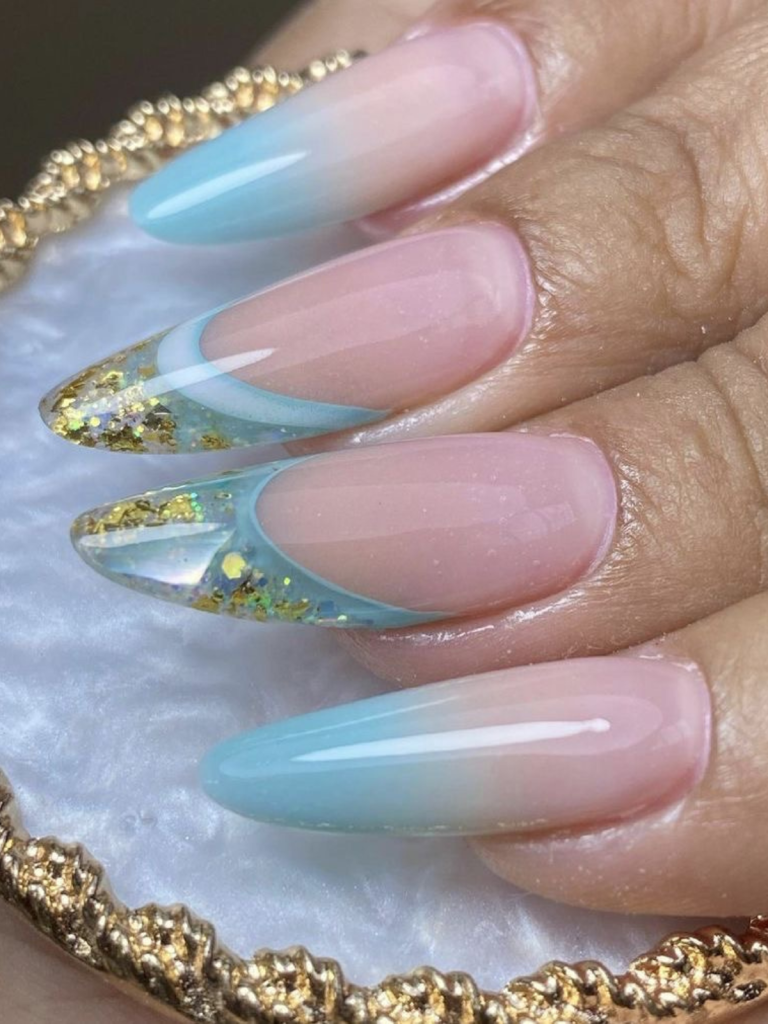 A warm pink to a tranquil light blue is a two-color gradient that looks like a sunset blending with the ocean. Gold tips are added at the top to provide an elegant contrast and a touch of luxury. The almond shape is a classic choice that adds to the feminine side of the design and makes it a versatile style for both the daytime and the evening.