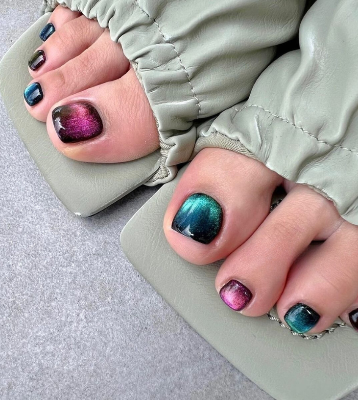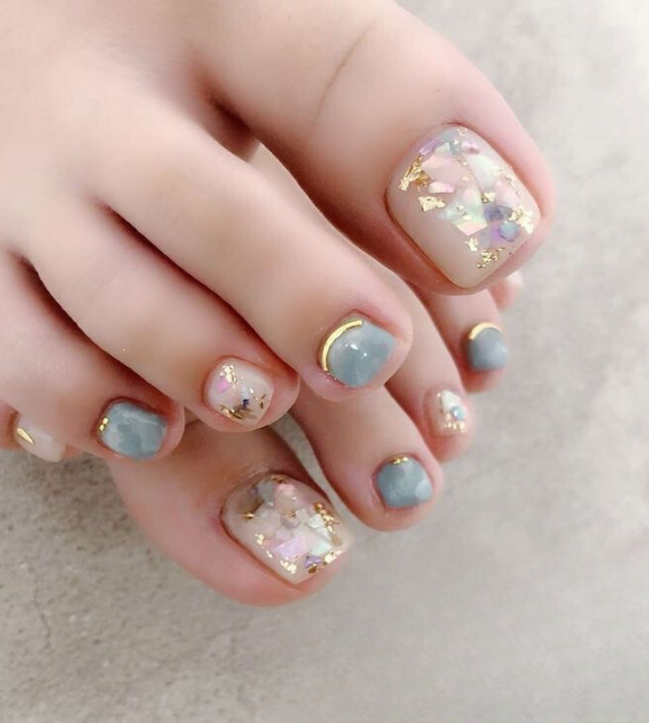 Sporting their adventurous and bold outlook, the toenails are in the entire universe. The toenails represent different planets, with dazzling pink and blue colors spiraling around them and glitter covering them in a nebulous style. This set is for a vibrant soul, who is, in turn, a mark of the beauty of the universe, which is at our feet.