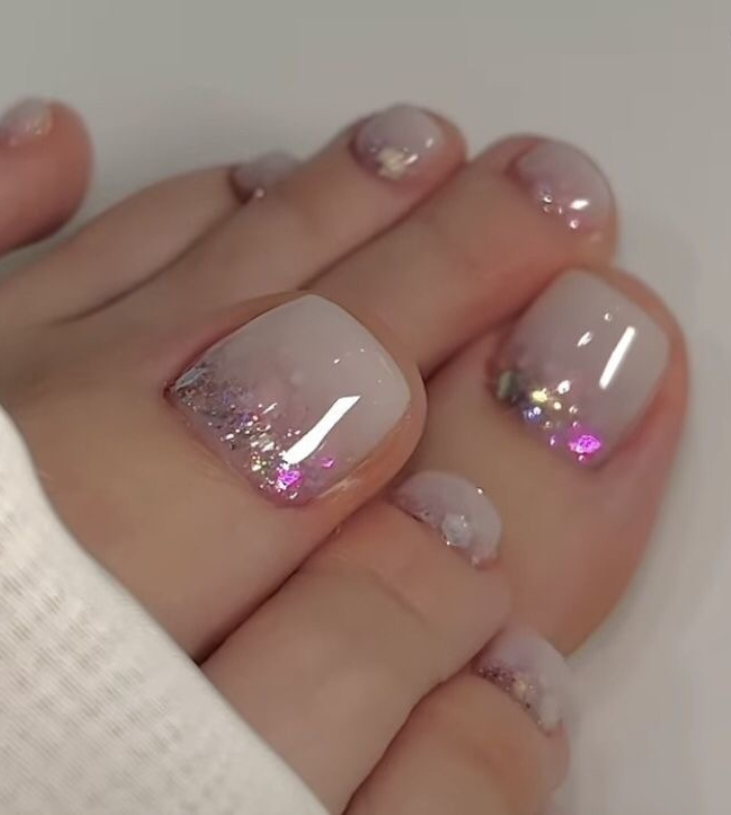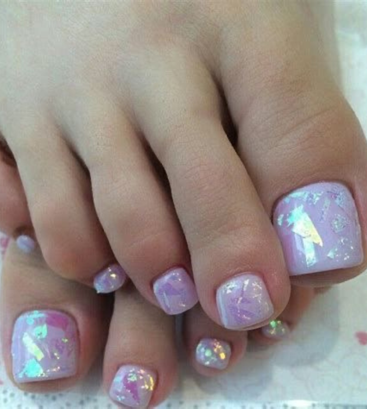 The toenails are a dreamlike representation of the tulle that feels soft to the touch exclusively. The light purple and the shiny of big snow-like flecks are opposites, yet they together create a light that equals the morning dew. Smaller toes are adorned with glitter that looks like it was put on by a fairy. The patterns suggest a wonderful place where refinement and magic coexist.