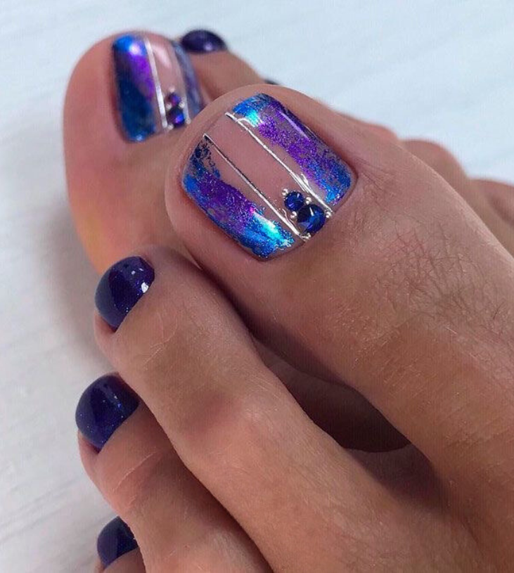 Brightly illuminated, these toenails have a cosmic mystery of deep purple glitter on them. The design is like a clear night sky dotted with shimmering stars for those who orbit the universe. For dreamers and stargazers, this daring color is a perfect mix of stealth and sheen.