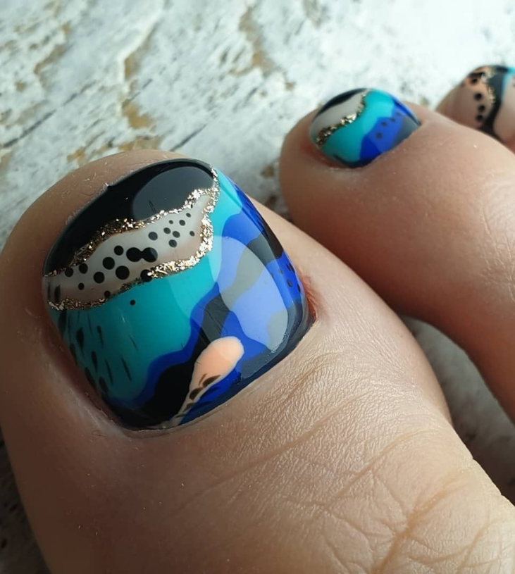 These nails are an abstract art design and are also a canvas for creativity. This combination of black, blue, and teal is a twisted entanglement of the colors and is enhanced with golden glitter, which is the artistic style of this design. The people who carry this look are fashion leaders, and for them, the body is the only medium for creating art.