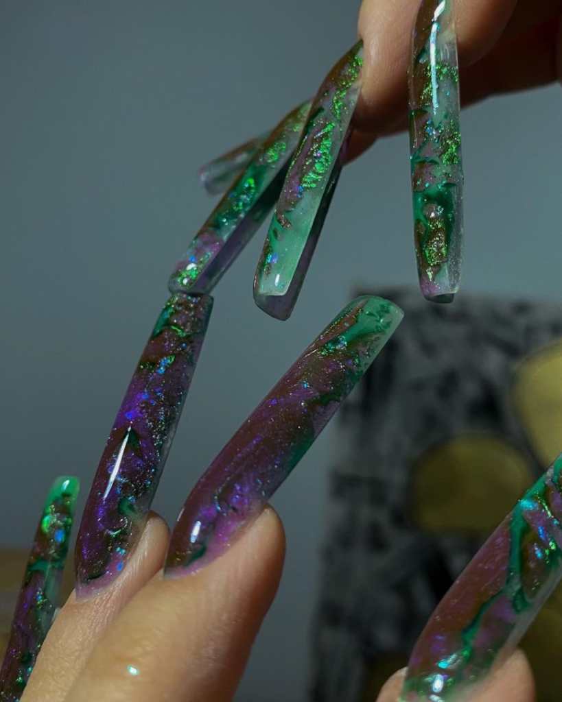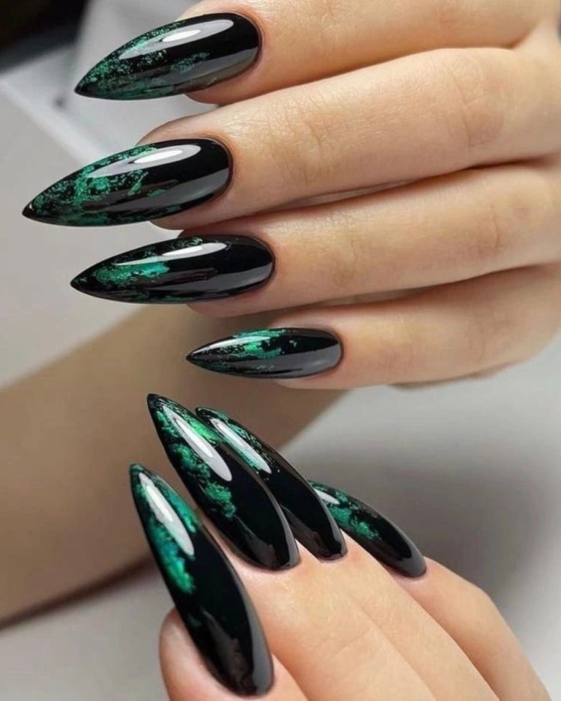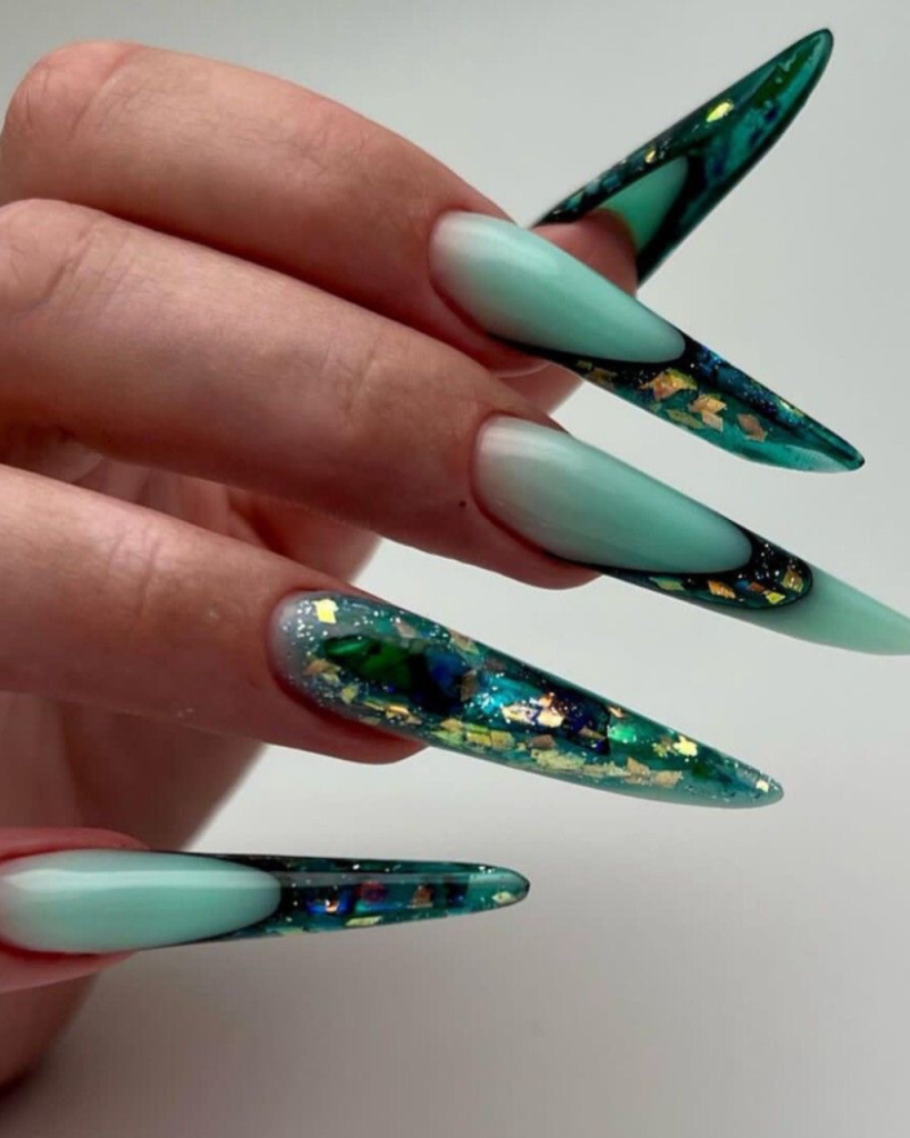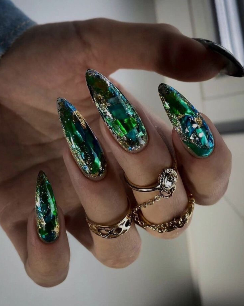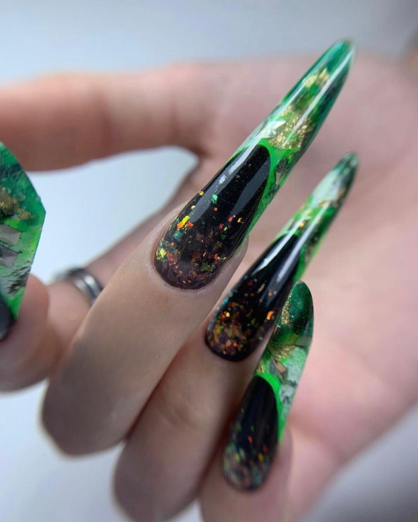 Envision the depths of an emerald sea, where the light reverberates showcasing a variety of colors in a dynamic dance. The incredible beauty of this phenomenon is expressed in the first design. With these nails that are long and shaped to look like the coffin which is designed perfectly, they have a black base color that is mixed with a dark green mosaic. The result is a very deep look that is totally green. Besides, the green seems not only to twinkle but also to have an entire universe trapped inside it, which turns each of these nails into a little piece of art. These nails are ideal for women who want to add a hint of shine and mystery to their outfit sestival are exceptional positions.