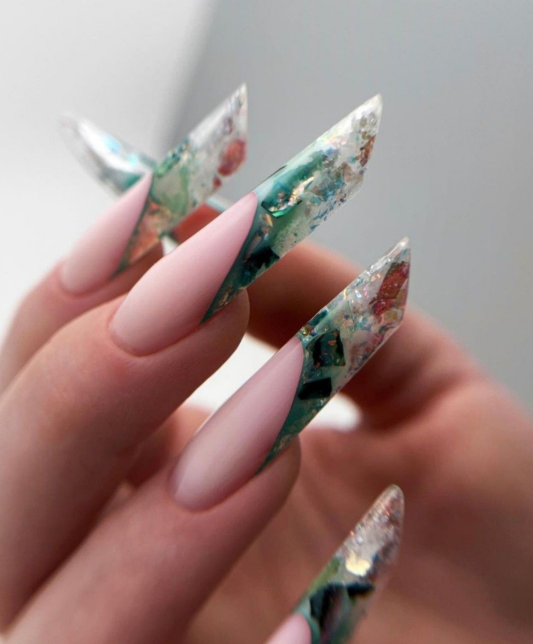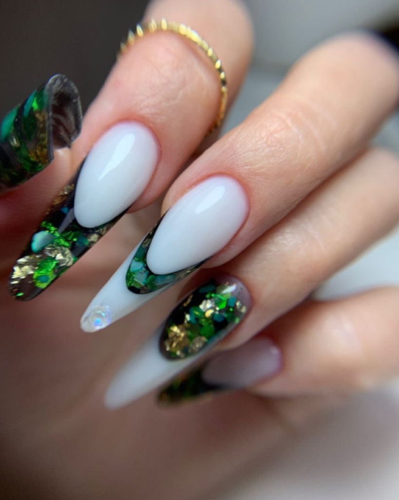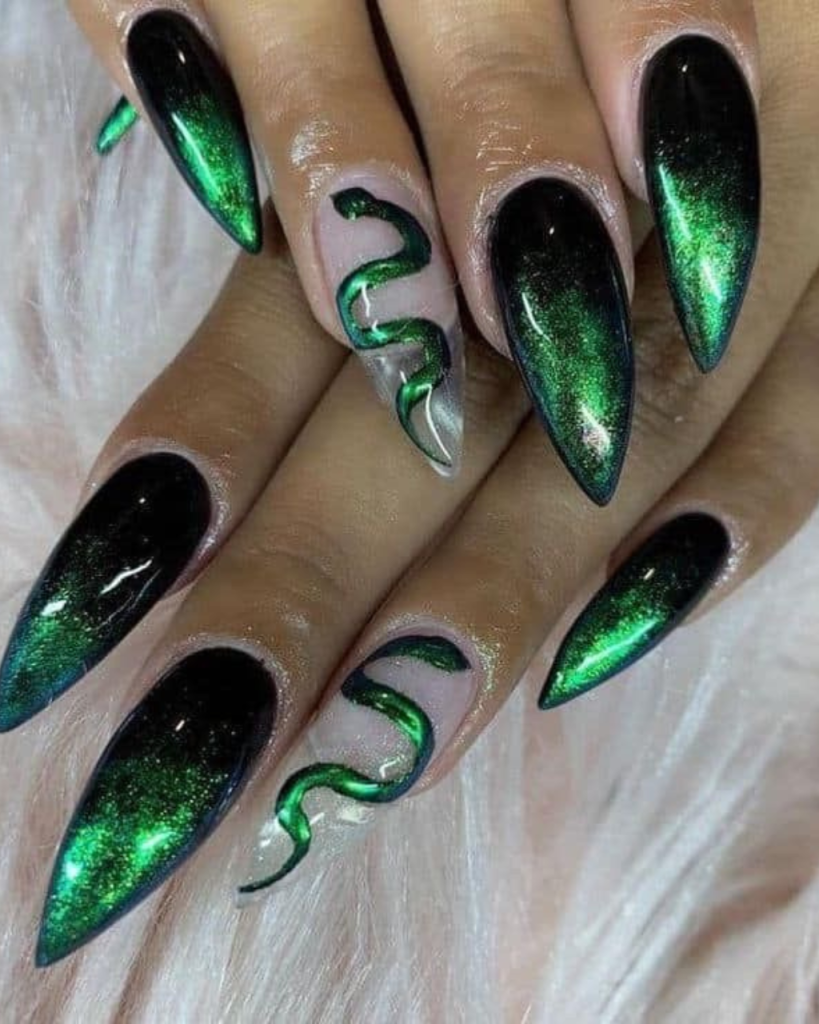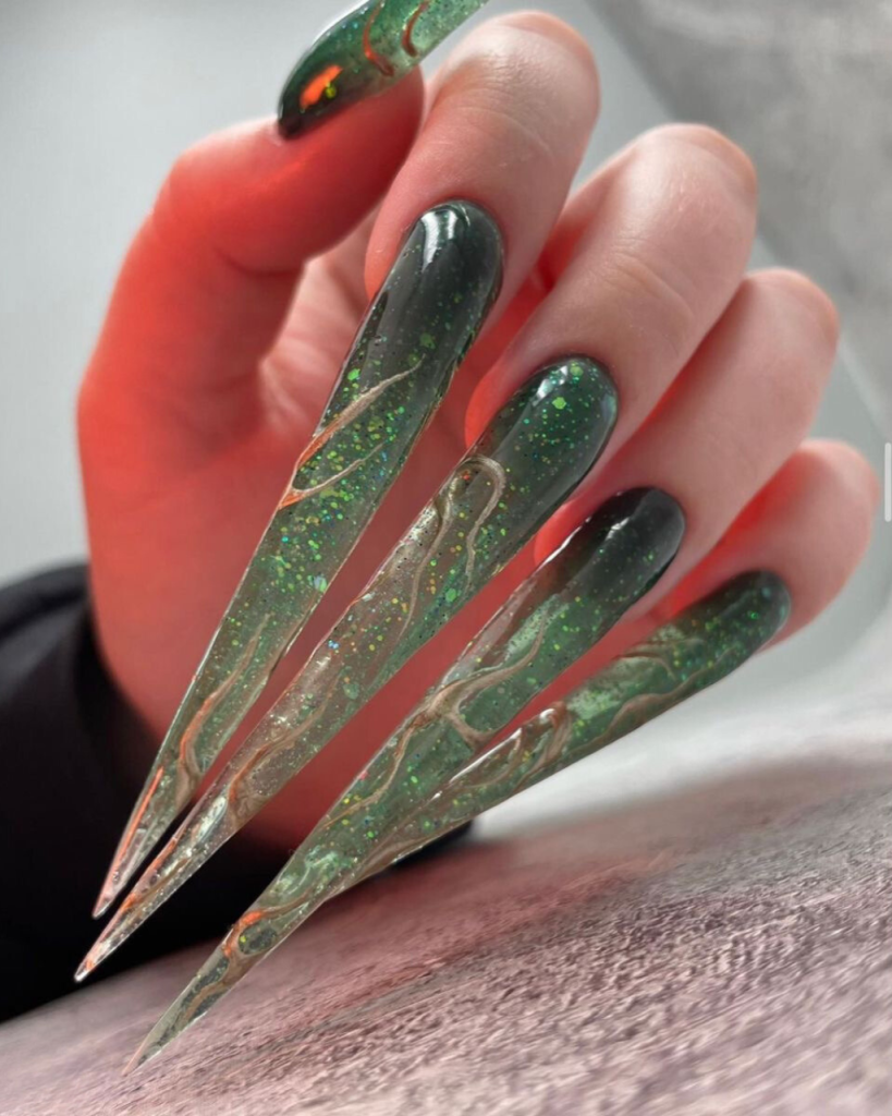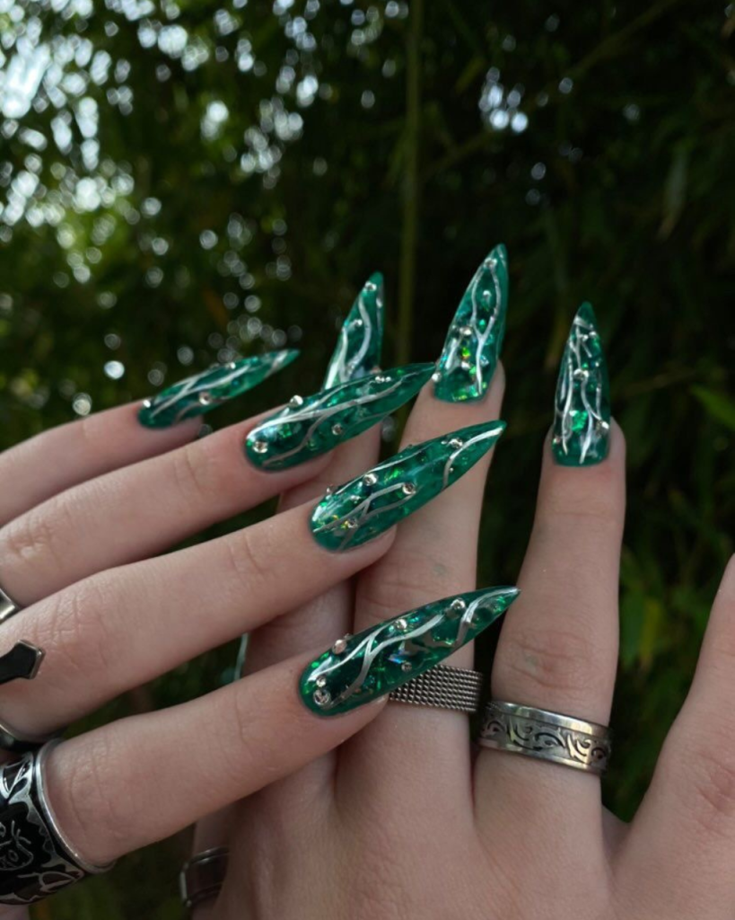 Envision the depths of an emerald sea, where the light reverberates showcasing a variety of colors in a dynamic dance. The incredible beauty of this phenomenon is expressed in the first design. With these nails that are long and shaped to look like the coffin which is designed perfectly, they have a black base color that is mixed with a dark green mosaic. The result is a very deep look that is totally green. Besides, the green seems not only to twinkle but also to have an entire universe trapped inside it, which turns each of these nails into a little piece of art. These nails are ideal for women who want to add a hint of shine and mystery to their outfit sestival are exceptional positions.