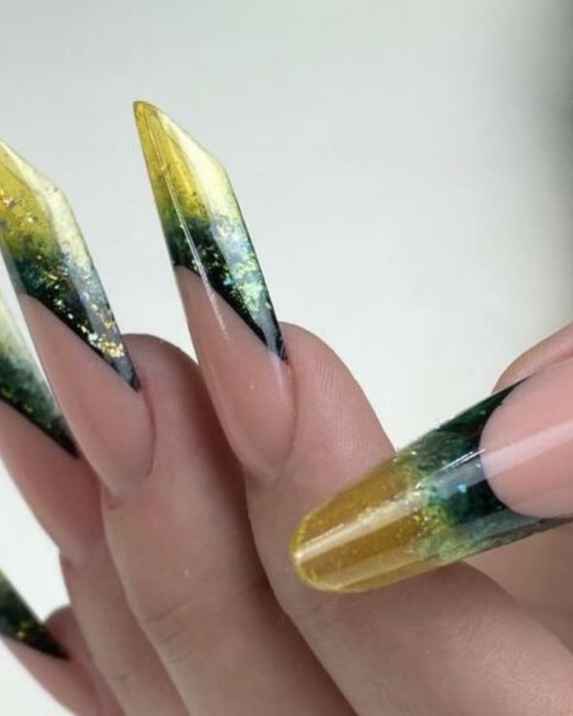 Envision your nails conversing with the hidden secrets of an enchanting woods. Here, a subtle-ombre of greens that starts from a shimmery pink at the base to a vague, dark green sparkles at the tips. The design is a refined compound of feminism and boldness here and there, with the flickering of glitter resembling the drops of dew on the leaves in the morning light. The elongated central nails that finish with a fine point are a great example of the coffin form that includes both a contemporary and classic style. Suitable for a woman who easily attracts attention with modesty and chic.