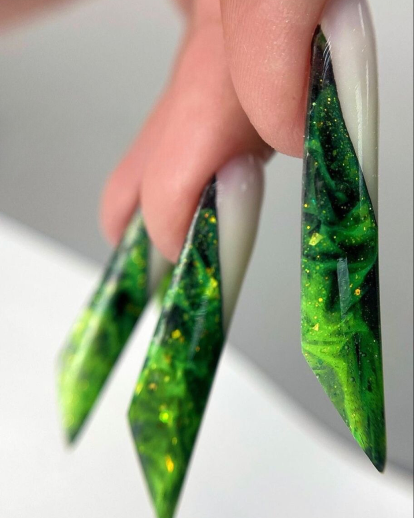 Sleek, sharp, and utterly striking, this design is inspired by the green blades of grass that are so bright they are almost tangible. The lengthy fingernails are exchanged for the long trees nails are lost in the environment and are surrounded. This design represents the modern individual who loves to create a significant impact despite the simple things in life.