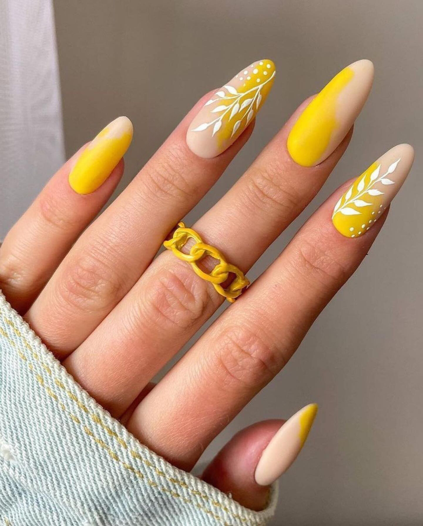 During the summertimes, when the sun is at its peak and the days last longer, a short almond nail polish effect accentuated with bright yellow color gradients is like a small part of summer at your fingertips. Trendywhite flowers give a subtle look of romance and nostalgia to this style making it ideal for weekend brunches or shopping in your favorite store. The shade change from pastel to the sunny color at the tip actually describes the calm summer moods to the lively ones.