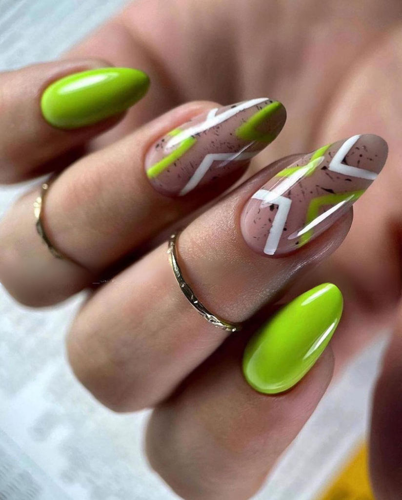 These elongated almond nails painted in electric green are an obvious reference to the bold spirits and the lushness of nature in full bloom. Along with abstract art in white and a hint of pink, this design is a conversation starter, ideal for those who enjoy adding a neon pop to their outfit. The beauty of contemporary art blends with the boldness of colors here.