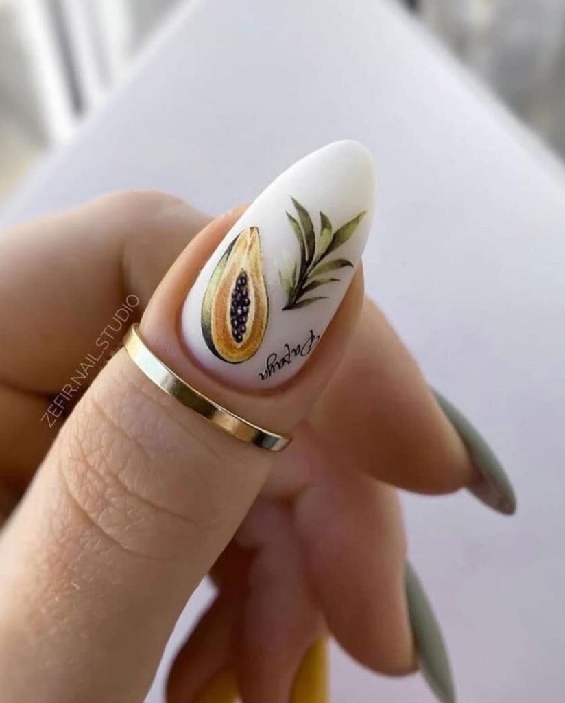 A lengthy almond nail dressed in the full-bodied and warm colors of a papaya narrates the stories of the tropical getaways and afternoon mimosas. The special exceptional detail in the fruit’s figure, together with soft green leaves, carries you to the exclusive summer rest. This design combines the brightness of the orange with the tranquility of the foliage, thus achieving a balance that is both cool and fashionable.