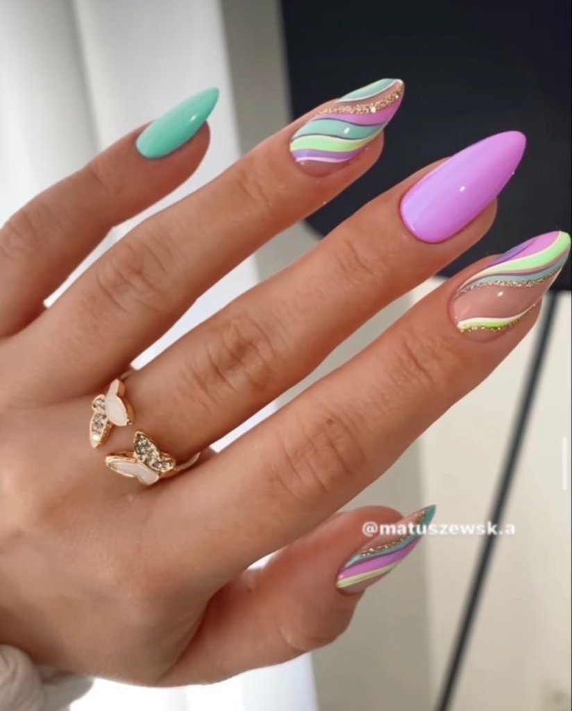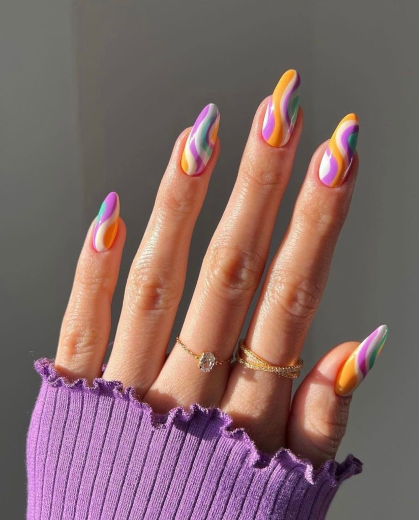These long almond nails with the soft swirls of pastel purples, oranges, and greens are reminiscent of the intriguing color palette of a summer sunset. It is a design that talks about the motion, creativity, and the combination of thoughts—similar to a group of friends hanging out together at a summer party.