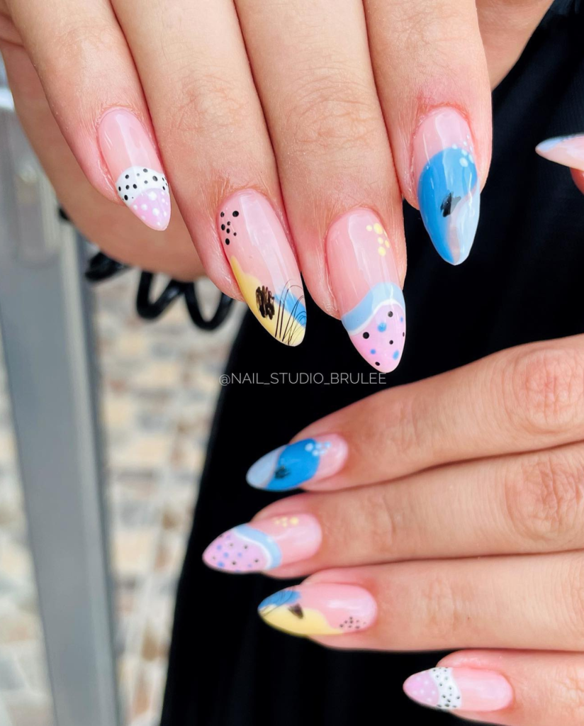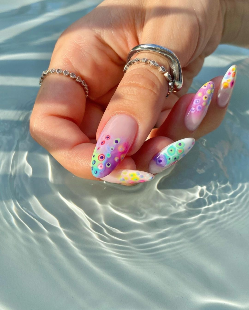 This is a unique version of the classic French tip. The long almond-shaped nails with polka dots and soft colors are the perfect addition to any outfit. The 2024 models are innovative and, therefore, they are associated with young people who are free and easy. A day in the park, where you are eating with your friends, and nails are accompanying you are all funny parts of the cute and bright summer season.