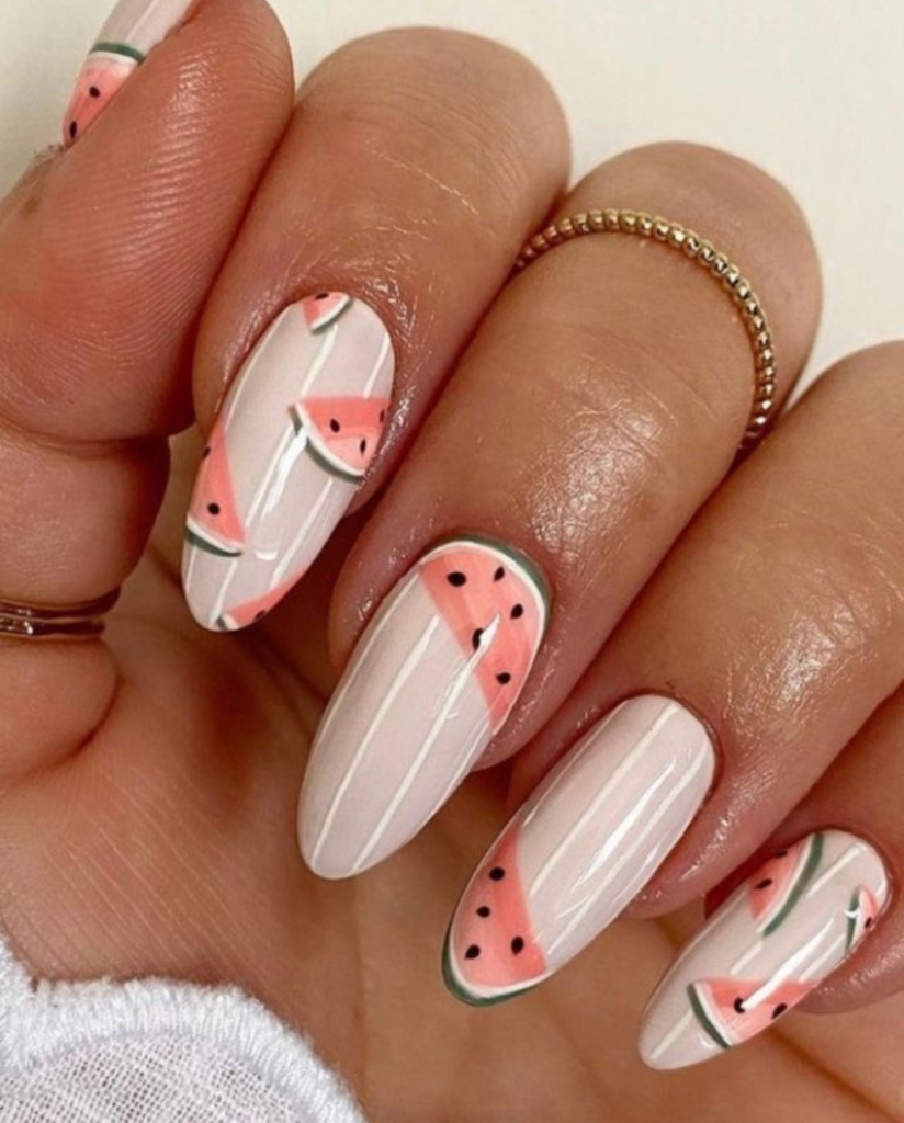 Summer is not truly summer unless you eat watermelon, and this is exactly what the watermelon-themed short almond nails are about. Therefore, the idea is the watermelon slicers on white background which are a reference to the picnic days and sunny afternoons in the backyard. This design of three colors, green, pink, and white is a perfect combination for the opoosite sexy but sweet look.