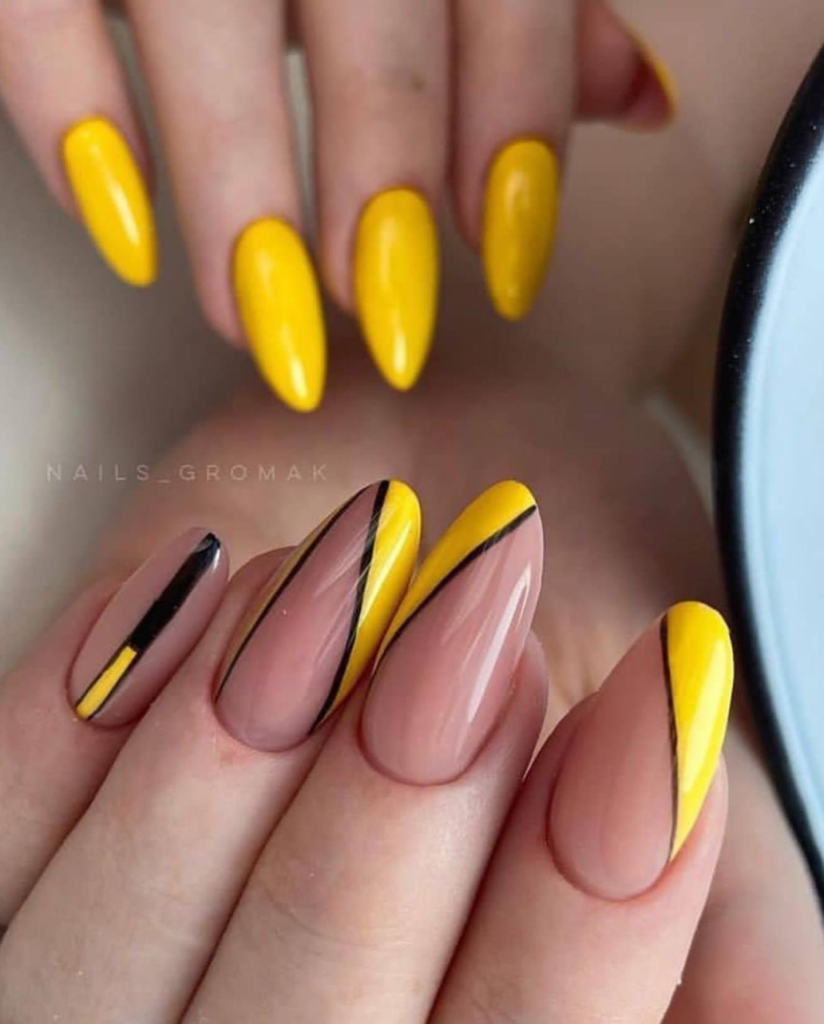 The stylish mid-blacks of the」がThe statement almond nails in vibrant yellow marching bold have the addition of stylish black. A long nail is an appropriate material for an art paint where one paint stripe is contrasting to another. Independent of this work, it makes the woman who wears it the center of the crowd and a truly fabulous person like these summer rays.