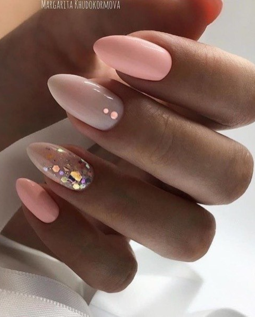 For all minimalists, these nails with short almond shape are trendy yet uncomplicated. This design consists of a very neutral soft pink base and a unique single statement nail that is covered with sparkling colorful confetti. The joyous summer vibe is very gently tipped off by the confetti while the design’s simplicity is preserved at the right level. The addition of the sparkly confetti is just perfect to upgrade a chic but simple look.
