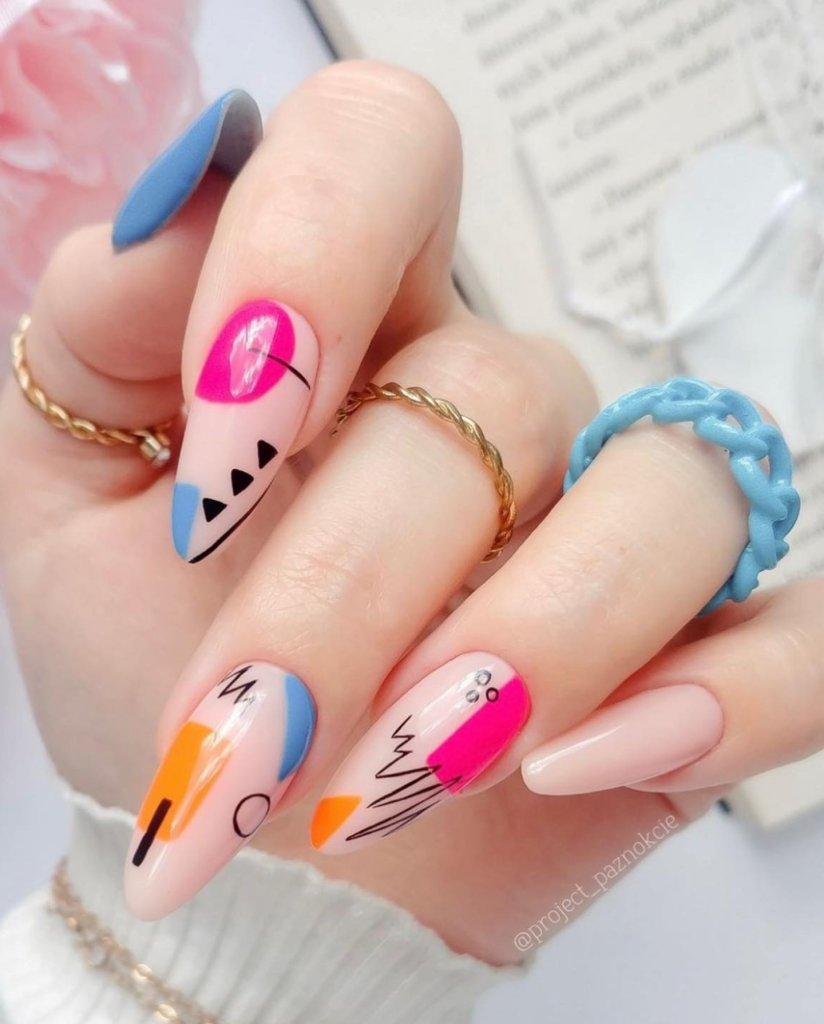 The modern art scene inspires these long almond nails, featuring abstract shapes in pink, blue, and orange. This design reflects the creative spirit and individuality of the wearer, perfect for art gallery visits or creative brainstorming sessions in airy summer studios.